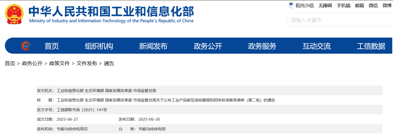 • 2025-08-06 工業(yè)和信息化部等四部門關(guān)于公布工業(yè)產(chǎn)品碳足跡核算規(guī)則團(tuán)體標(biāo)準(zhǔn)推薦清單(第二批)的通告